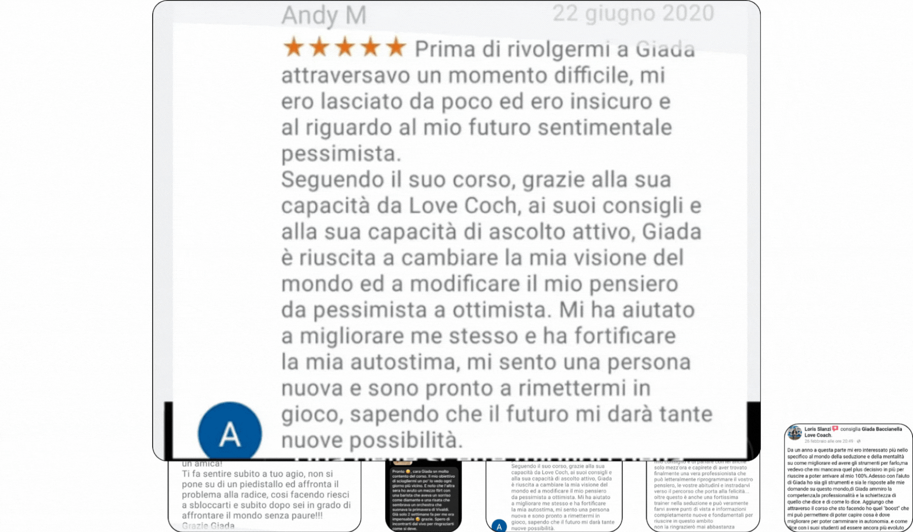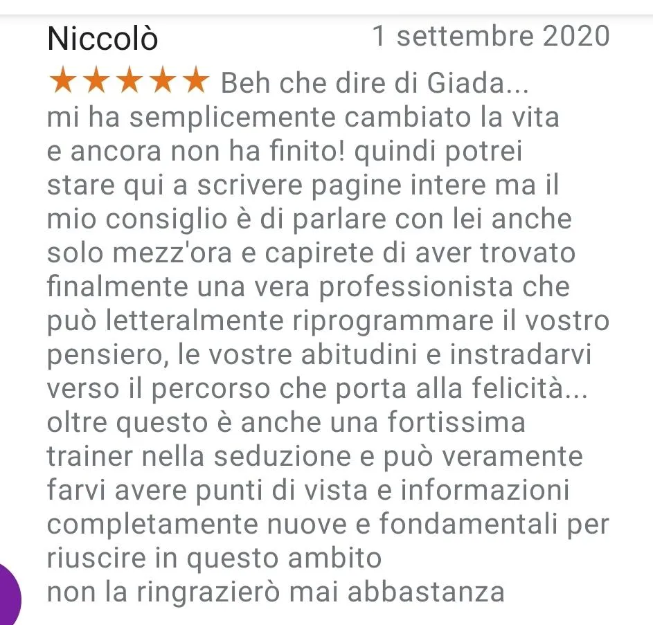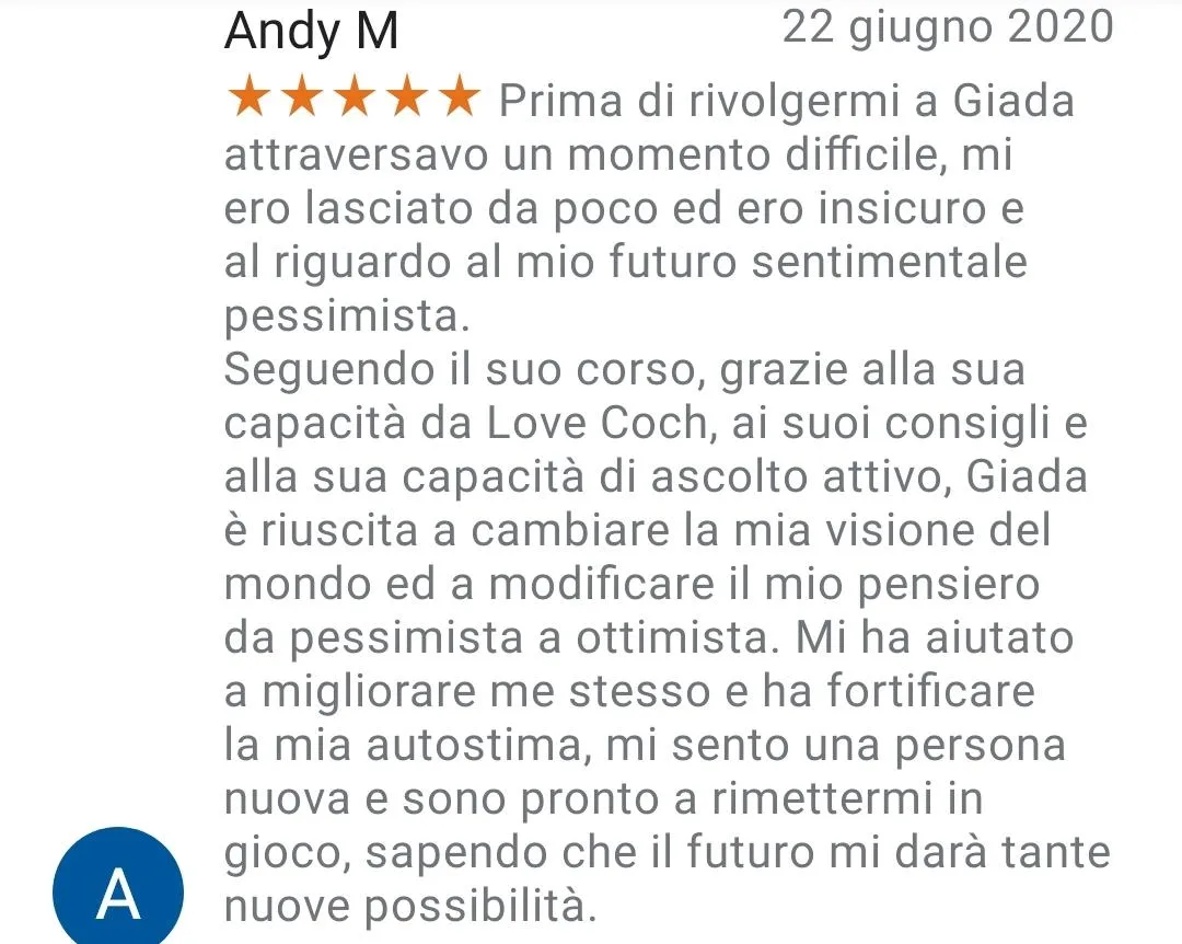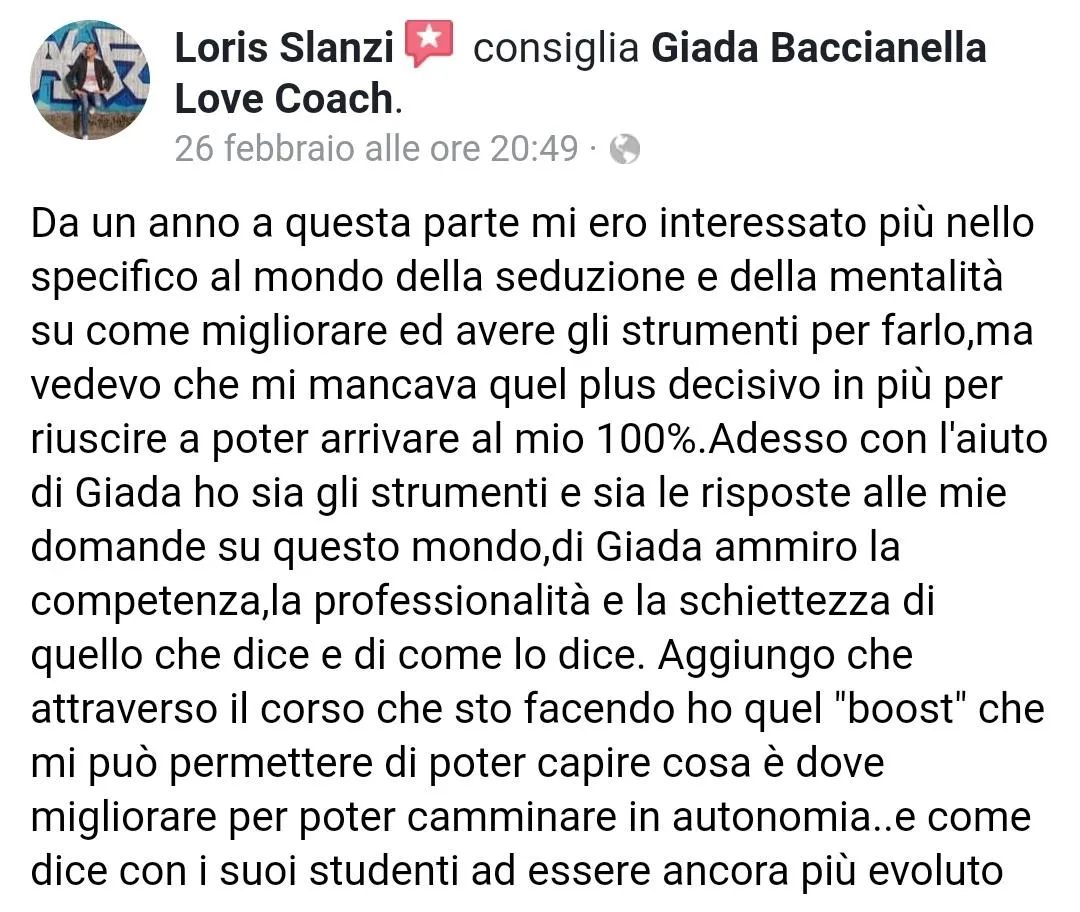 I servizi offerti da Love Coach Academy di Giada Baccianella hanno finalità esclusivamente educative, formative e di intrattenimento. Non si configurano in alcun modo come prestazioni sanitarie, psicologiche o psicoterapeutiche. Le persone che presentano patologie o disturbi fisici e/o psicologici sono invitate a rivolgersi a professionisti sanitari abilitati.