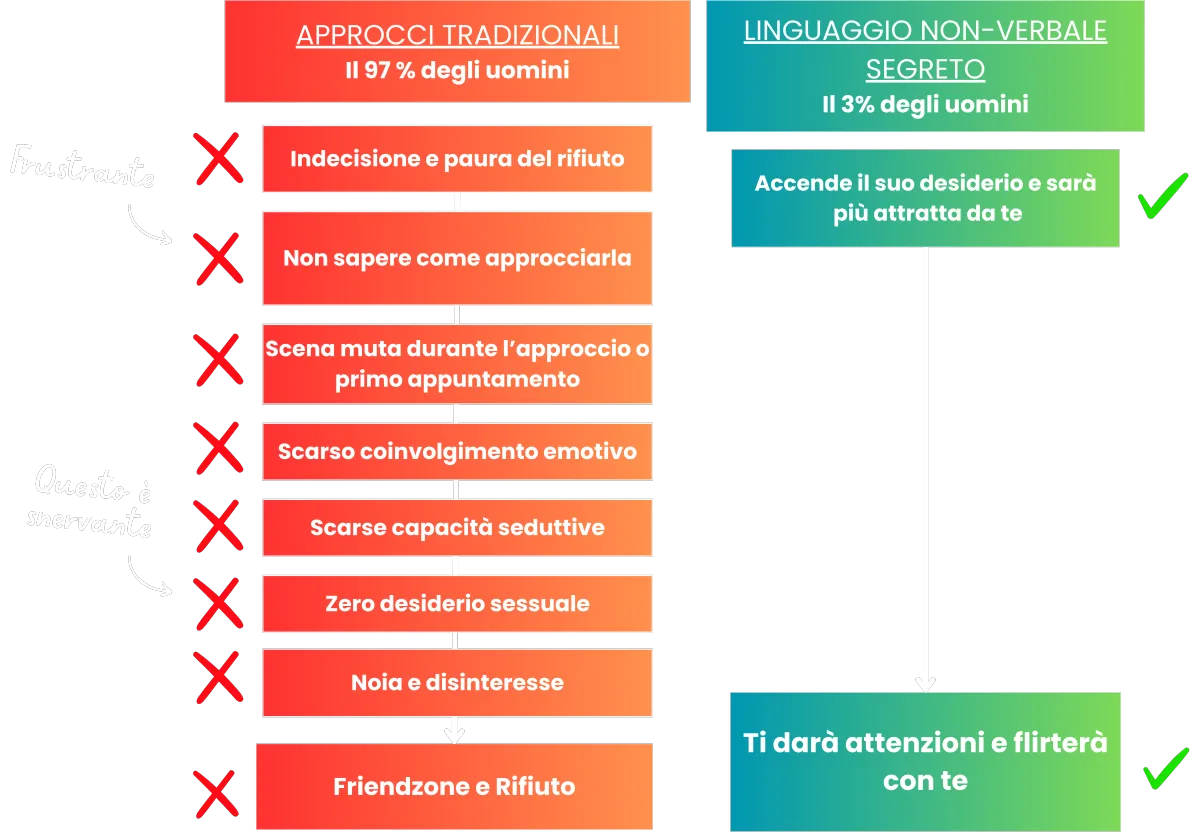 Quando accedi al Linguaggio Segreto Dell’Attrazione invece, scoprirai ciò che veramente ogni donna desidera da un uomo. Saprai come pensa una donna e scoprirai il linguaggio non-verbale che accende in lei il desiderio di approcciarti e conoscerti sempre di più.